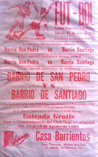Ha sido tradicional el enfrentamiento, en el fútbol, entre los barrios de San Pedro y Santiago, en el campo deportivo Los Héroes, que antes fue El Arenal, pero no podemos dejar fuera al equipo de fútbol "Social", patrocinado por Francisco Arámburo Moya, y el "Huracán", que manejaba Rubén Rodríguez Palestina.