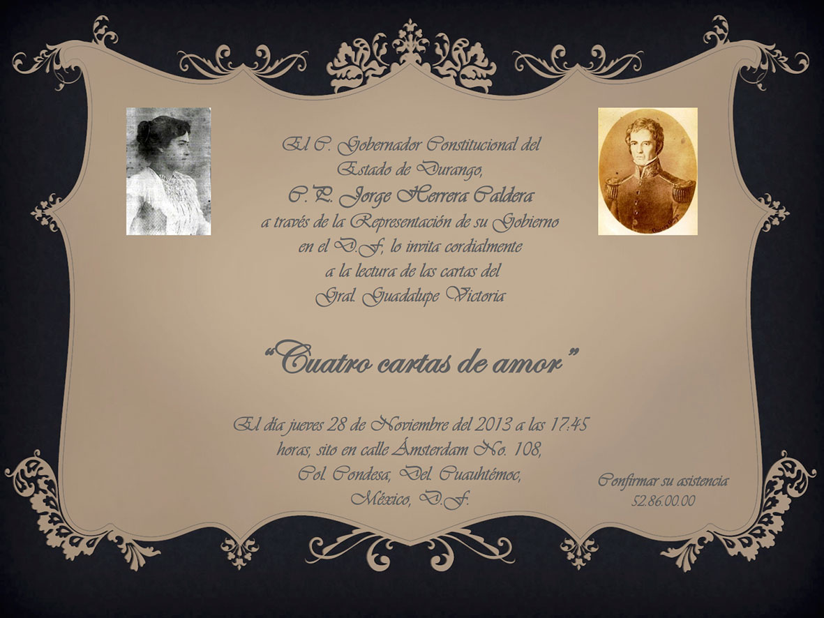 El gobernador de Durango hizo la invitación a la reunión, que terminó convertida en una velada verdaderamente emotiva, con una magnífica participación, preguntas y comentarios por parte de los asistentes. Condujo el doctor Fernando Ulises Adame de León, en representación del gobernador, que no pudo asistir porque se encontraba en el Vaticano. Nos acompañaron, leyendo algunas de las cartas el periodista Leopoldo Mendívil y su esposa, Guadalupe Ruiz, que hizo una conmovedora lectura de la que se atribuye a María Antonia (En Tlapacoyan le tocó leer esta carta a la maestra Martha Ortega Cantabrana, Cronista de Chiconcuac y Presidente de la Comisión de Admisiones de la Asociación Nacional de Cronistas de Ciudades Mexicanas, y fue también muy felicitada). Armando Victoria Santamaría leyó, entre otros textos, la carta que Guadalupe Victoria envió a su esposa desde la "Fortaleza de Perote" el 15 de febrero de 1843, un mes y seis días antes de fallecer. Este cronista, por su parte, elaboró el guión de la velada, hizo el análisis de cada una de las cartas y explicó cómo descubrió éstas junto con Victoria Santamaría.